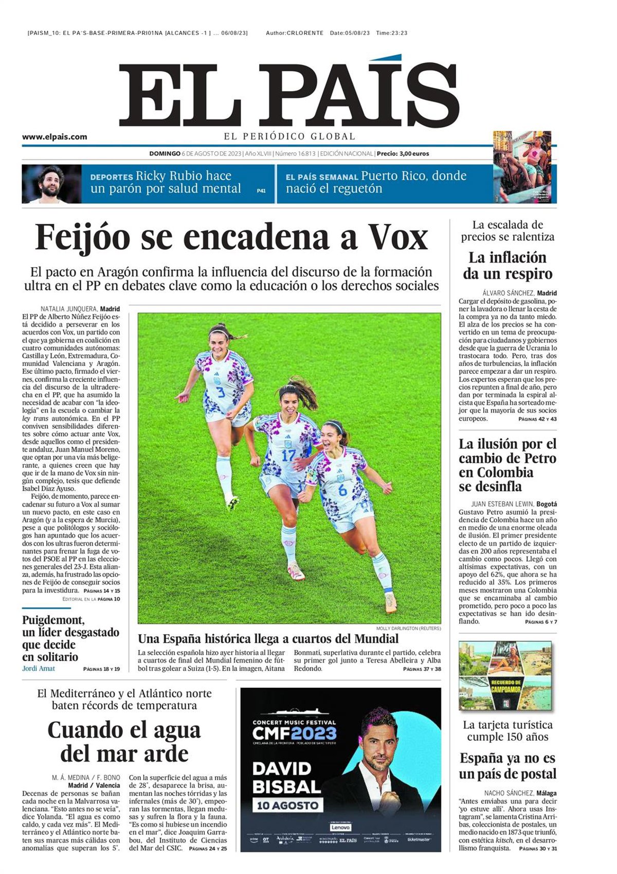 EL PAÍS: "Feijóo se encadena a Vox"; "La inflación da un respiro"; "Una España histórica llega a cuartos del Mundial"; "La ilusión por el cambio de Petro en Colombia se desinfla".