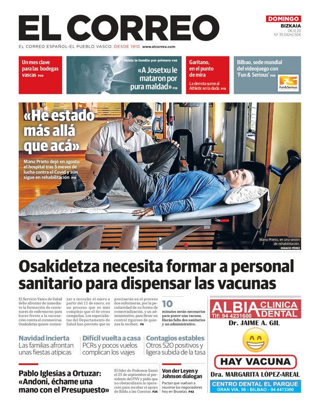EL CORREO: "He estado más allá que acá"; "Un mes clave para las bodegas vascas"; "A Josetxu le mataron por pura maldad"; "Garitano, en el punto de mira": "Bilbao, sede mundial del videojuego con 'Fun & Serious'"; "Osakidetza necesita formar a personal para dispensar las vacunas"; "Pablo Iglesias a Ortuzar: "Andoni, échame una mano con el Presupuesto""; "Von der Leyen y Johnson dialogan".