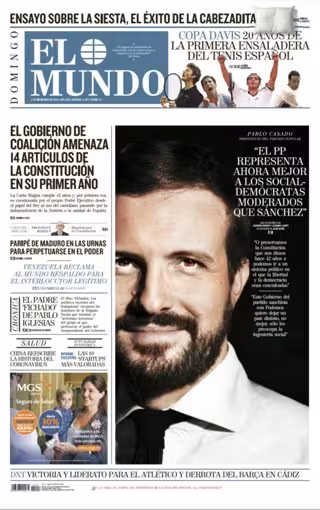 EL MUNDO: "Pablo Casado: "El PP representa ahora mejor a los social-demócratas moderados que Sánchez""; "Ensayo sobre la siesta, el éxito de la cabezadita"; "Copa Davis. 20 años de la primera ensaladera del tenis español"; "El Gobierno de coalición amenaza 14 artículos de la Constitución en su primer año"; "Paripé de Maduro en las urnas para perpetuarse en el poder"; "Venezuela reclama al mundo respaldo para el interlocutor legítimo"; "El padre 'fichado' de Pablo Iglesias"; "China reescribe la historia del coronavirus"; "Las 10 'startups' más valoradas"; "Victoria y liderado para el Atlético y derrota del Barça en Cádiz".