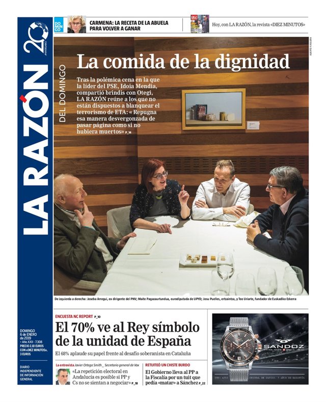 LA RAZÓN: "La comida de la dignidad"; "El 70% ve al Rey símbolo de la unidad de España"; "El Gobierno lleva al PP a la Fiscalía por un tuit que pedía 'matar' a Pedro Sánchez"; "La repetición electoral en Andalucía es posible si PP y Cs no se sientan a negociar".