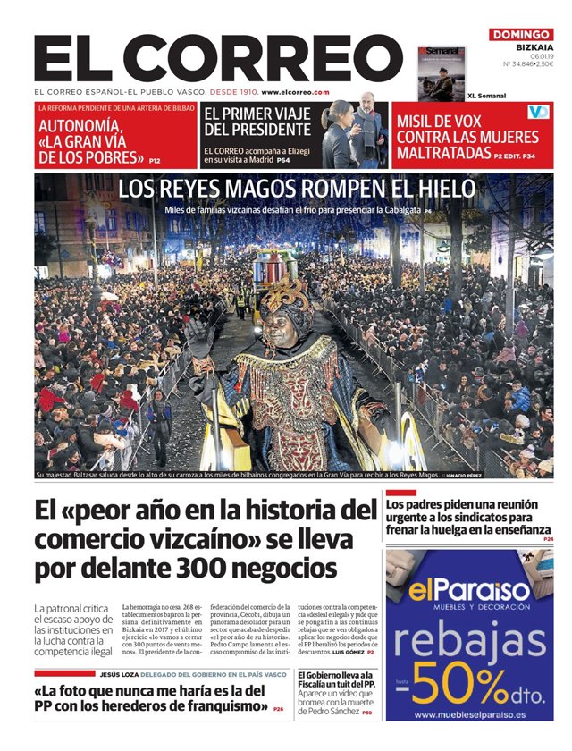 EL CORREO: "Los Reyes magos rompen el hielo" "Autonomía, la gran vía de los pobres"; "El primer viaje del presidente"; "Misil de VOX contra las mujeres maltratadas"; "El peor año en la historia del comercio vizcaíno se lleva por delante 300 negocios"; "Los padres piden una reunión urgente a los sindicatos para frenar la huelga en la enseñanza"; "La foto que nunca me haría es la del PP con los herederos del franquismo"; "El Gobierno lleva a la Fiscalía un tuit del PP".