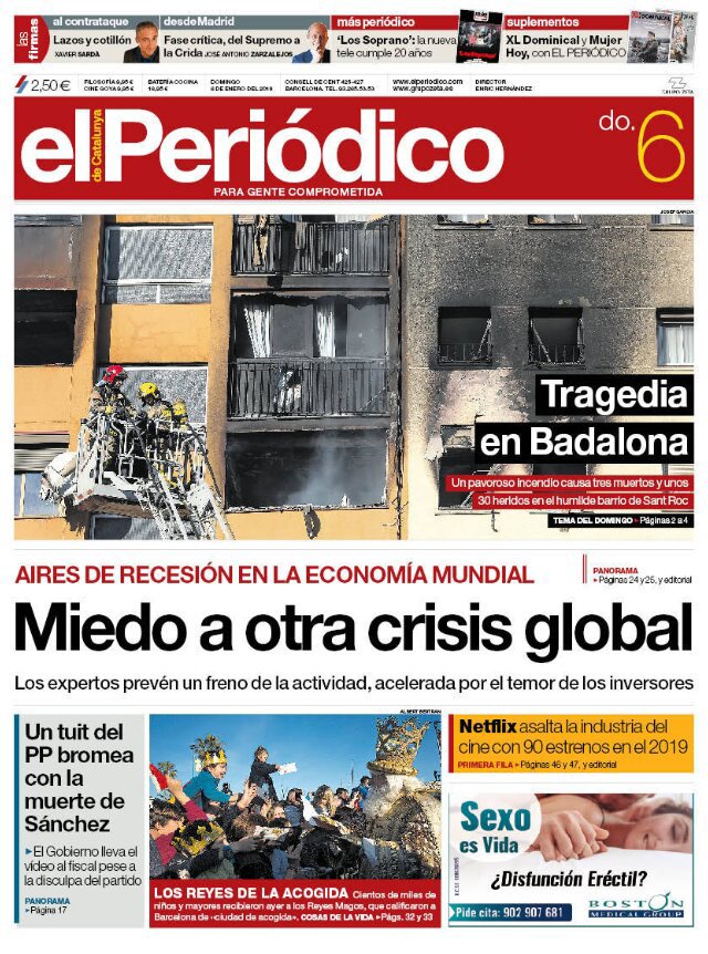 EL PERIÓDICO: "Tragedia en Badalona"; "Miedo a otra crisis global"; "Un tuit del PP bromea con la muerte de Sánchez"; "Los Reyes de la acogida"; "Netflix asalta la industria del cine con 90 estrenos en el 2019".