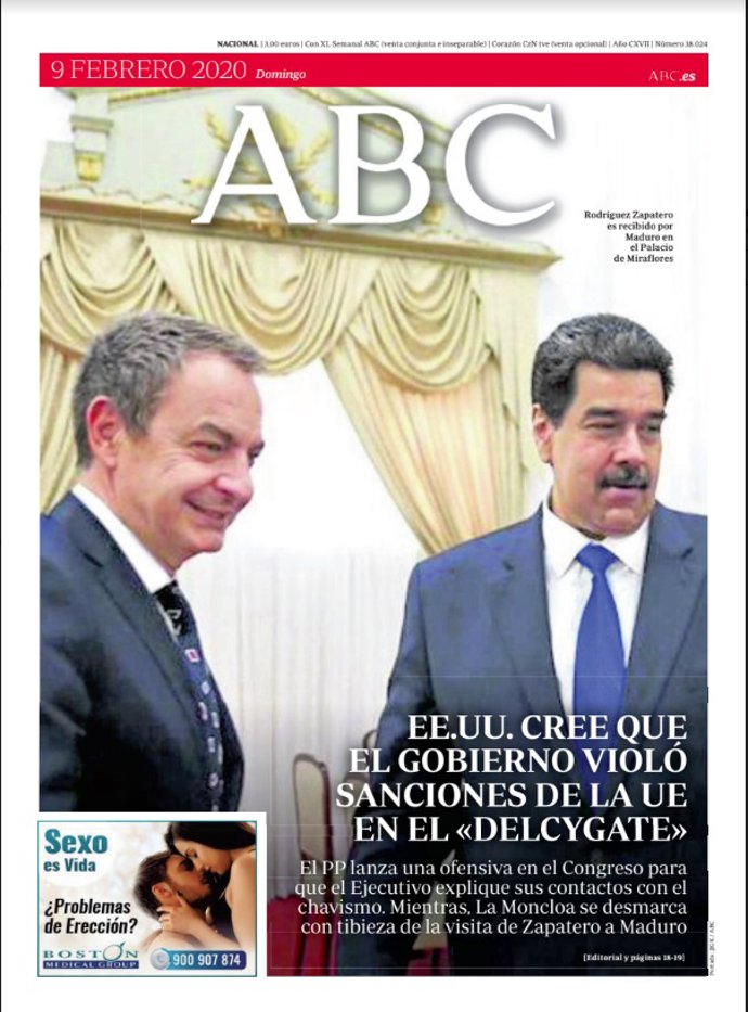 ABC: "EEUU cree que el Gobierno violó sanciones de la UE en el 'Delcygate'"; "Rodríguez Zapatero es recibido por Maduro en el Palacio de Miraflores"; "El PP lanza una ofensiva en el congreso para que el Ejecutivo explique sus contactos con el chavismo"; "La Moncloa se desmarca con tibieza de la visita de Zapatero a Maduro".