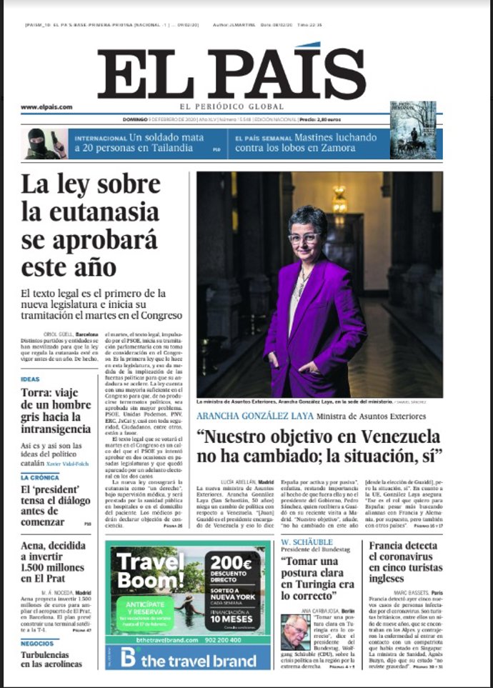 EL PAÍS: "La ley sobre la eutanasia se aprobará este año"; "Arancha González Laya: 'Nuestro objetivo en Venezuela no ha cambiado, la situación sí'"; "Torra: viaje de un hombre gris hacia la intransigencia"; "El 'president' tensa el diálogo antes de comenzar"; "Aena, decidida a invertir 1.500 millones en El Prat".