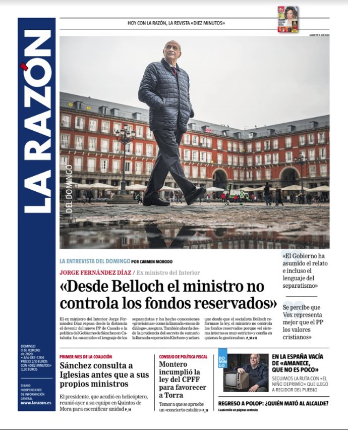 LA RAZÓN: "Jorge Fernández Díaz: 'Desde Belloch el ministro no controla los fondos reservados'"; "Sánchez consulta a Iglesias antes que a sus propios ministros"; "Montero incumplió la ley del CPFF para favorecer a Torra".