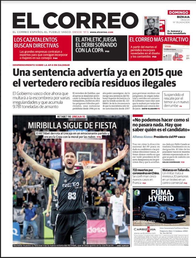 EL CORREO: "Desprendimiento sobre la AP-5 en Zaldibar. Una sentencia advertía ya en 2015 que el vertedero recibía residuos ilegales"; "Alfonso Alonso: 'No podemos hacer como si no pasara nada. Hay que saber quién es el candidato'"; "722 muertes por coronavirus en China"; "Matanza en Tailandia".