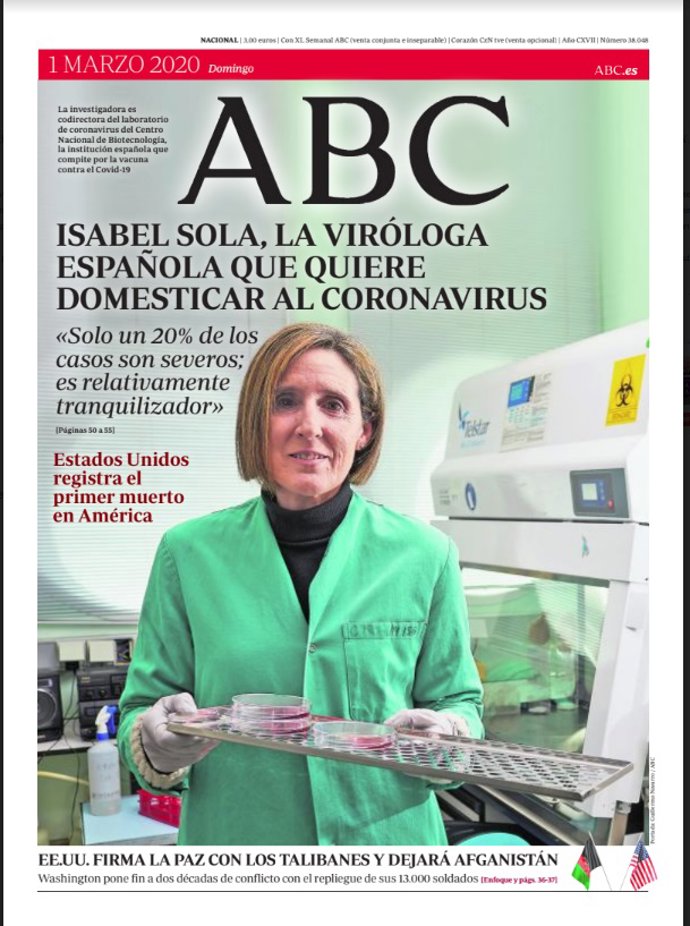 ABC: "Isabel Sola, la viróloga española que quiere domesticar al coronavirus: 'Solo un 20% de los casos son severos; es relativamente tranquilizador'"; "Estados Unidos registra el primer muerto en América"; "EEUU firma la paz con los talibanes y dejará Afganistán".