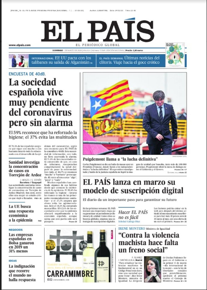 EL PAÍS: "La sociedad española vive muy pendiente del coronavirus pero sin alarma"; "Puigdemont llama a 'la lucha definitiva'"; "Sanidad investiga la concentración de casos en Torrejón de Ardoz"; "La UE busca una respuesta económica a la epidemia"; "Las empresas españolas en Bolsa ganaron en 2019 un 31% menos"; "Irene Montero: 'Contra la violencia machista hace falta un freno social'".