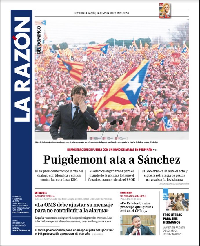 LA RAZÓN: "Puigdemont ata a Sánchez. Demostración de fuerza con un baño de masas en Perpiñán"; "Santiago Abascal: 'En Estados Unidospreocupa que Iglesias esté en el CNI'"; "El contagio económico pone en riesgo el plan del Ejecutivo: El PIB podría subir apenas un 1% este año".