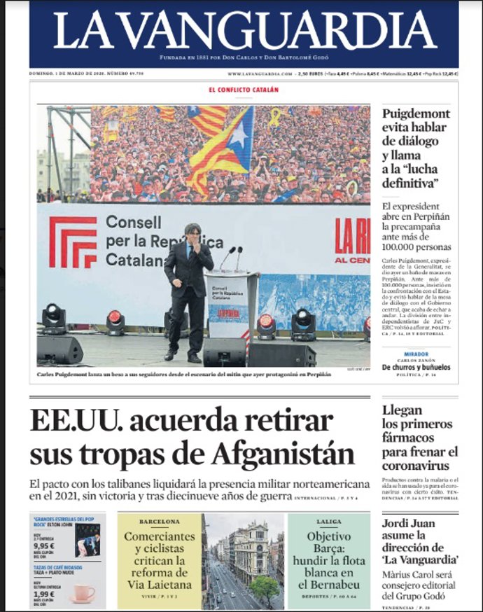 LA VANGUARDIA: "Puigdemont evita hablar de diálogo y llama a la 'lucha definitiva'"; "EEUU acuerda retirar sus tropas de Afganistán"; "Llegan los primero fármacos para frenar el coronavirus"; "Jordi Juan asume la dirección de 'La Vanguardia'".