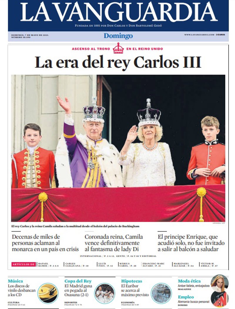 LA VANGUARDIA: "La era del rey Carlos III"; "El Madrid gana en pegada la Osasuna"; "El Euribor se acerca al máximo previsto"; "Los discos de vinilo desbancan a los CD".