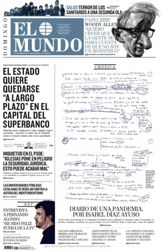 EL MUNDO: "El Estado quiere quedarse "a largo plazo" en el capital del superbanco"; "Inquietud en el PSOE: Iglesias pone en peligro la seguridad jurídica. Esto puede acabar mal"; "Las universidades públicas catalanas se rebelan contra la asfixia del independentismo"; "Diario de una pandemia, por Isabel Díaz Ayuso"; "Entrevista a Fernando Alonso: He sido feliz fuera de la F1".