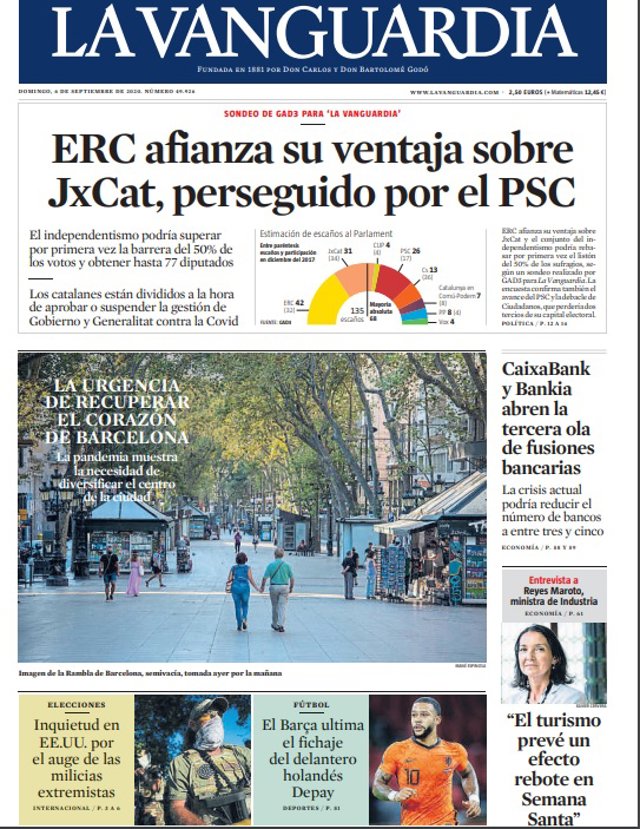 LA VANGUARDIA: "ERC afianza su ventaja sobre JxCat, perseguido por el PSC"; "CaixaBank y Bankia abren la tercera ola de fusiones bancarias"; "La urgencia de recuperar el corazón de Barcelona"; "Entrevista a Reyes Maroto: El turismo prevé un efecto rebote en Semana Santa". "Inquietud en EEUU por el auge de las milicias extremistas"; "El Barça ultima el fichaje del delantero holandés Depay".