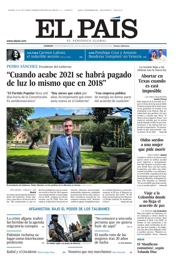 EL PAÍS: "Cuando acabe 2021 se habrá pagado de luz lo mismo que en 2018"; "Abortar en Texas cuando es casi imposible"; "Oídos sordos a una mujer que pide morir"; "Viaje a la Colombia donde no llega la paz"; "Afganistán,bajo el poder de los talibanes".
