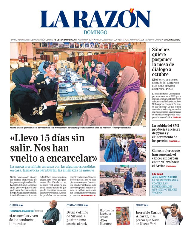 LA RAZÓN: "Llevo 15 días sin salir. Nos han vuelto a encarcelar"; "Sánchez quiere posponer lamesa de diálogo a octubre"; "La subida del SMI producirá el cierre de pymes y el incremento de los precios"; "Cinco mujeres que han superado el cáncer se embarcan en un velero hacia el Ártico".