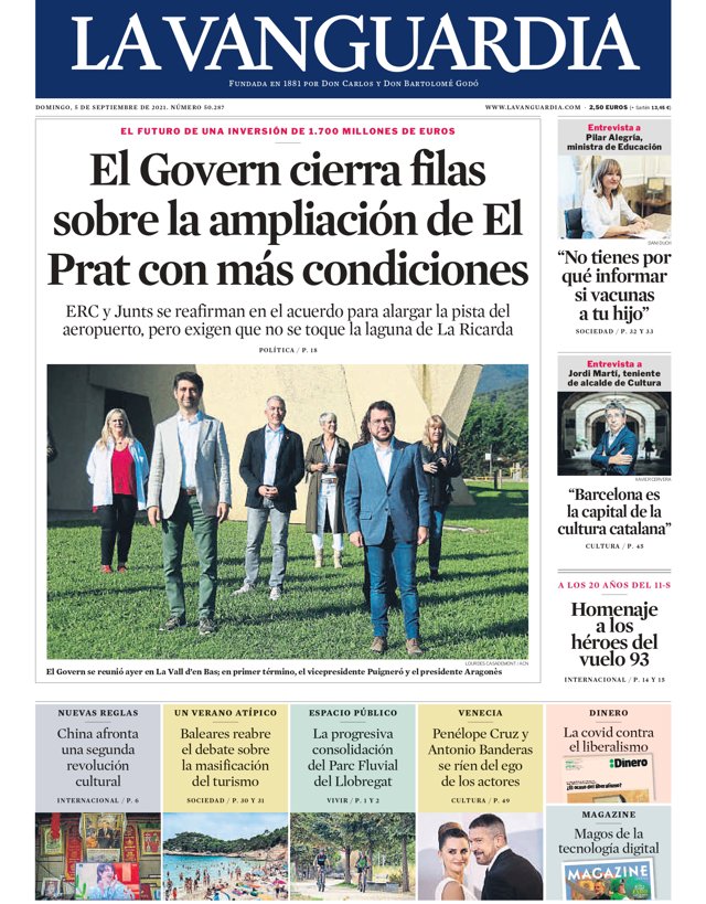LA VANGUARDIA: "El Govern cierra filas sobre la ampliación de El Prat con más condiciones"; "China afronta una segunda revolución cultural"; "Baleares reabre el debate sobre la masificación del turismo"; "La progresiva consolidación del Parc Fluvial de Llobregat"; "Penélope Cruz y Antonio Bandera se ríen del ego de los actores".
