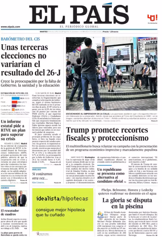 EL PAÍS: "Unas terceras elecciones no variarían el resultado del 26-J"; "Trump promete recortes fiscales y proteccionismo"; "Un republicano se presenta como alternativa al candidato oficial"; "Un informe estatal pide a RTVE un plan para superar su crisis".