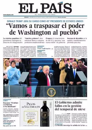 EL PAÍS: "Donald Trump jura su cargo como 45º presidente de Estados Unidos: "Vamos a traspasar el poder de Washington al pueblo""; "El Gobierno admite fallos en la gestión del temporal de nieve"; "La fiscalía investiga la subida de la luz".