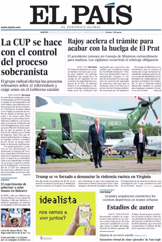 EL PAÍS: "La CUP se hace con el control del proceso soberanista"; "Rajoy acelera el trámite para acabar con la huelga de El Prat"; "Trump se ve forzado a denunciar la violencia racista en Virginia"; "El experimento de gobernar a ocho manos en Baleares".