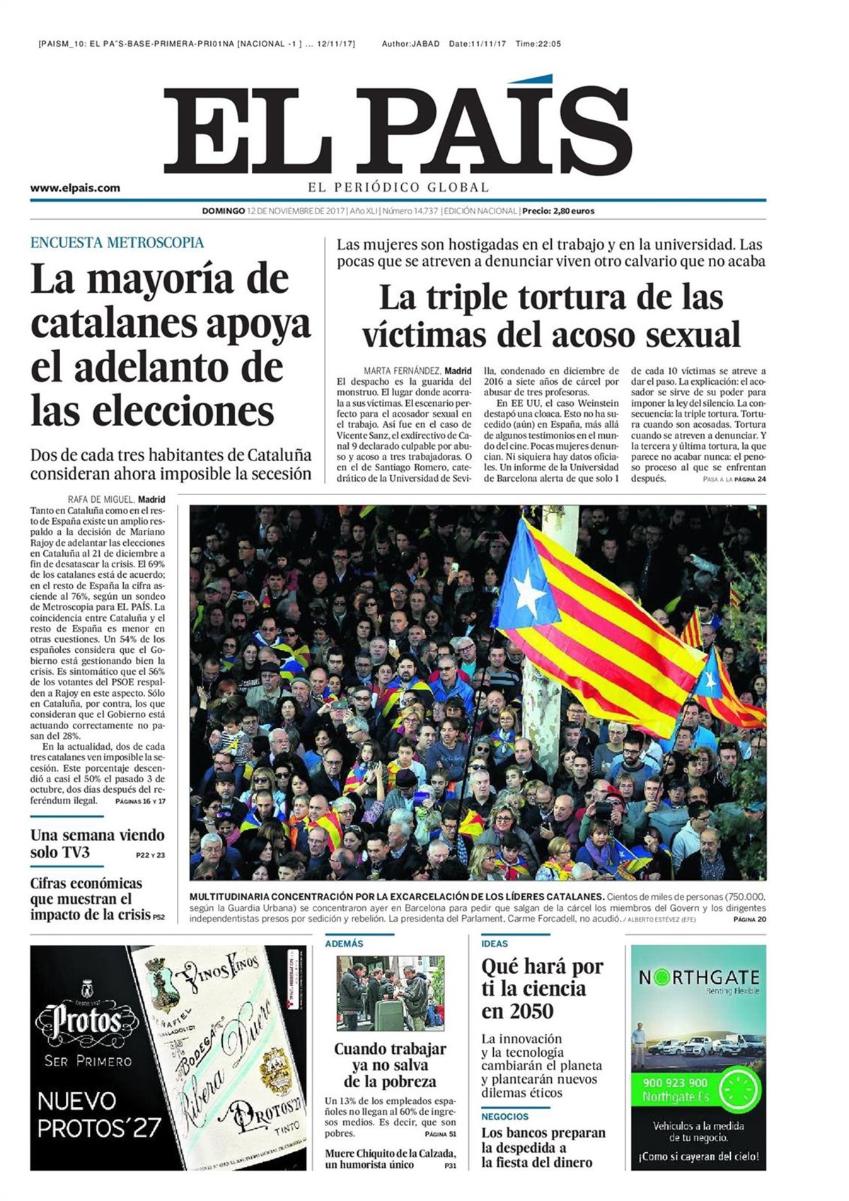 EL PAÍS: "La mayoría de catalanes apoya el adelanto de las elecciones"; "La triple tortura de las víctimas del acoso sexual"; "Una semana viendo solo TV3"; "Cifras económicas que muestran el impacto de la crisis"; "Multitudinaria concentración por la excarcelación de los líderes catalanes"; "Cuando trabajar ya no salva de la pobreza"; "Qué hará por ti la ciencia en 2050"; "Los bancos preparan la despedida a la fiesta del dinero".