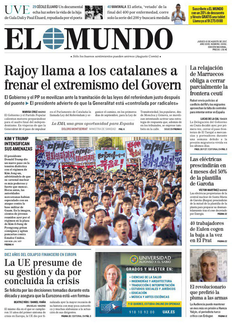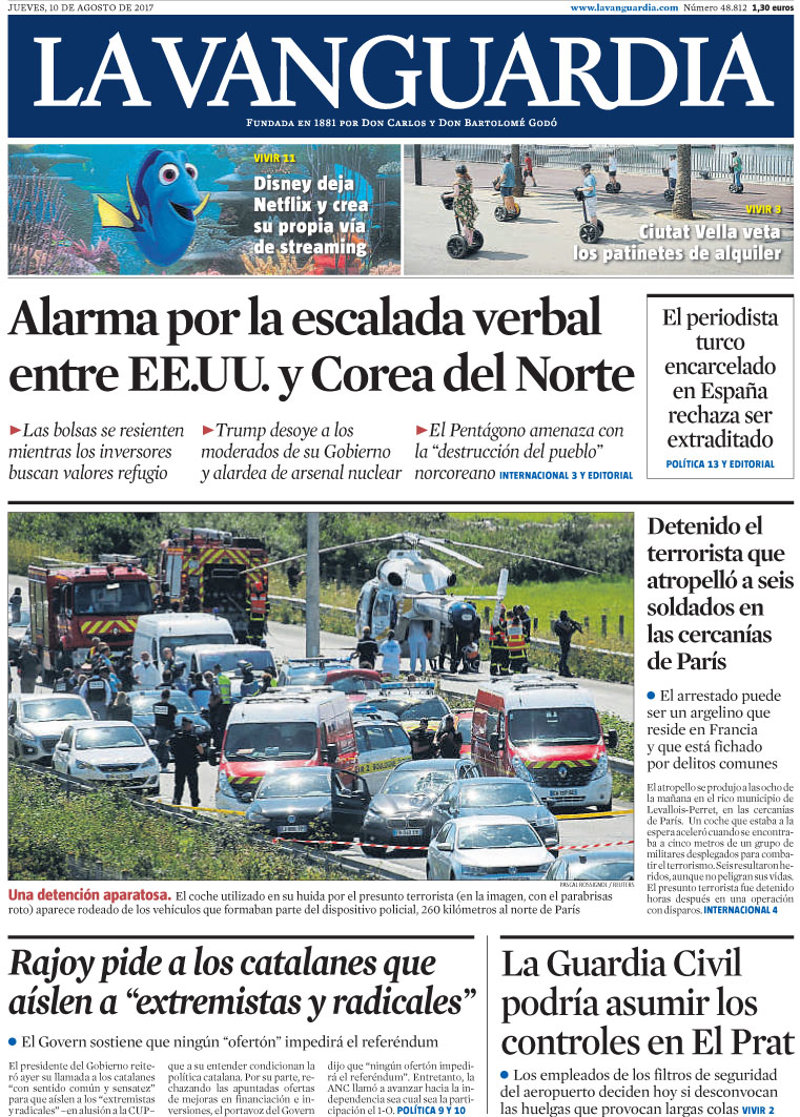 LA VANGUARDIA: "Alarma por la escalada verbal entre EE.UU. y Corea del Norte"; "Rajoy pide a los catalanes que aíslen a "extremistas y radicales"; "El periodista turco encarcelado en España rechaza ser extraditado"; "Detenido el terrorista que atropelló a seis soldados en las cercanías de París"; "La Guardia Civil podría asumir los controles en El Prat".