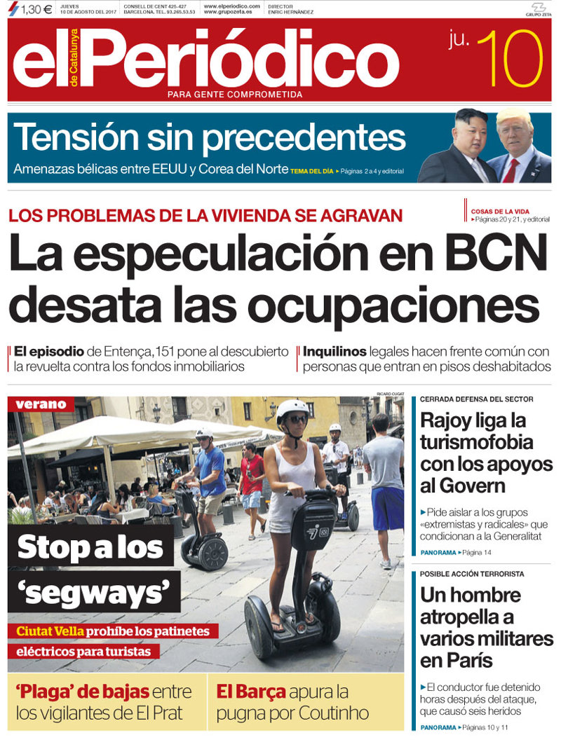 EL PERIÓDICO: "La especulación en Barcelona desata las ocupaciones"; "Tensión sin precedentes. Amenazas bélicas entre EEUU y Corea del Norte"; "Rajoy liga la turismofobia con los apoyos al Govern"; "Un hombre atropella a varios militares en París".