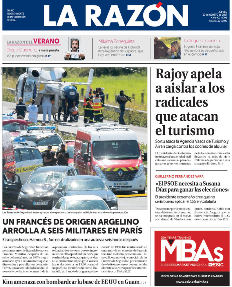 LA RAZÓN: "Rajoy apela a aislar a los radicales que atacan el turismo"; "Un francés de origen argelino arrolla a seis militares en París"; "Fernández Vara: "El PSOE necesita a Susana Díaz para ganar las elecciones"; "Kim amenaza con bombardear la base de EE UU en Guam".
