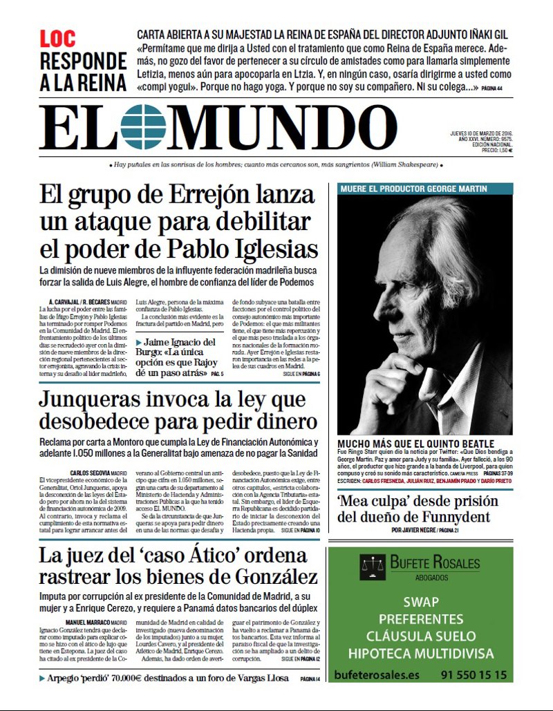EL MUNDO: "El grupo de Errejón lanza un ataque para debilitar el poder de Pablo Iglesias. Jaime Ignacio del Burgo: "La única opción es que Rajoy dé un paso atrás""; "Muere el productor George Martin. Mucho más que el quinto Beatle"; "Junqueras invoca la ley que desobedece para pedir dinero"; "'Mea culpa' desde prisión del dueño de Funnydent"; "La juez del 'caso Ático' ordena rastrear los bienes de González"; "Arpegio 'perdió' 70.000E destinados a un foro de Vargas Llosa".