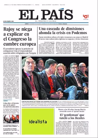 EL PAÍS: "Rajoy se niega a explicar en el Congreso la cumbre europea"; "Una cascada de dimisiones ahonda la crisis en Podemos"; "Sánchez reconoce que tendrá que gobernar en coalición"; "Colau dice al Ejército que no lo quiere en una feria educativa"; "Muere a los 90 años George Martin, el 'gentleman' que tuteló a los Beatles".