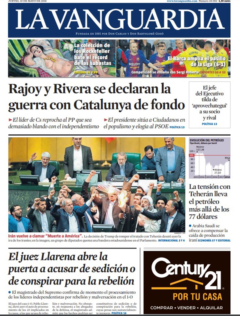 LA VANGUARDIA: "Rajoy y Rivera se declaran la guerra con Catalunya de fondo"; "El juez Llarena abre la puerta a acusar de sedición o de conspirar para la rebelión"; "La tensión con Teherán lleva el petróleo más allá de los 77 dólares".