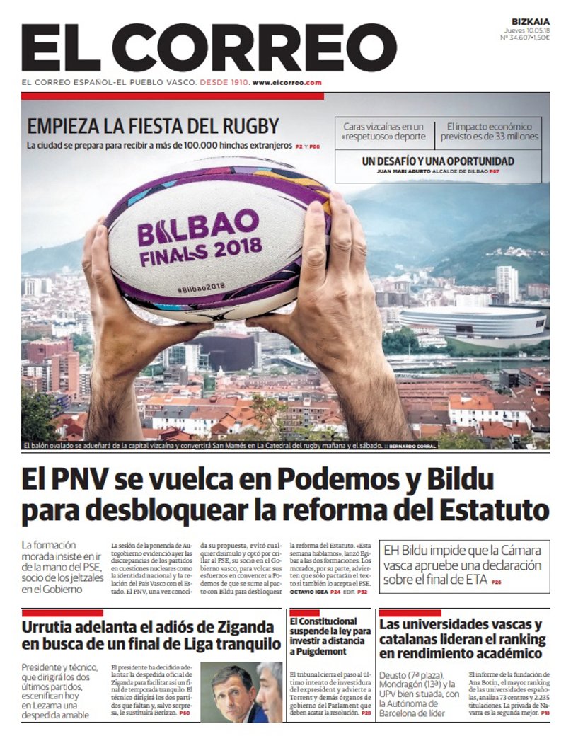 EL CORREO: "Empieza la fiesta del rugby"; "El PNV se vuelca en Podemos y Bildu para desbloquear la reforma del Estatuto"; "Urrutia adelanta el adiós de Ziganda en busca de un final de Liga tranquilo"; "Las universidades vascas y catalanas lideran el ranking en rendimiento académico".