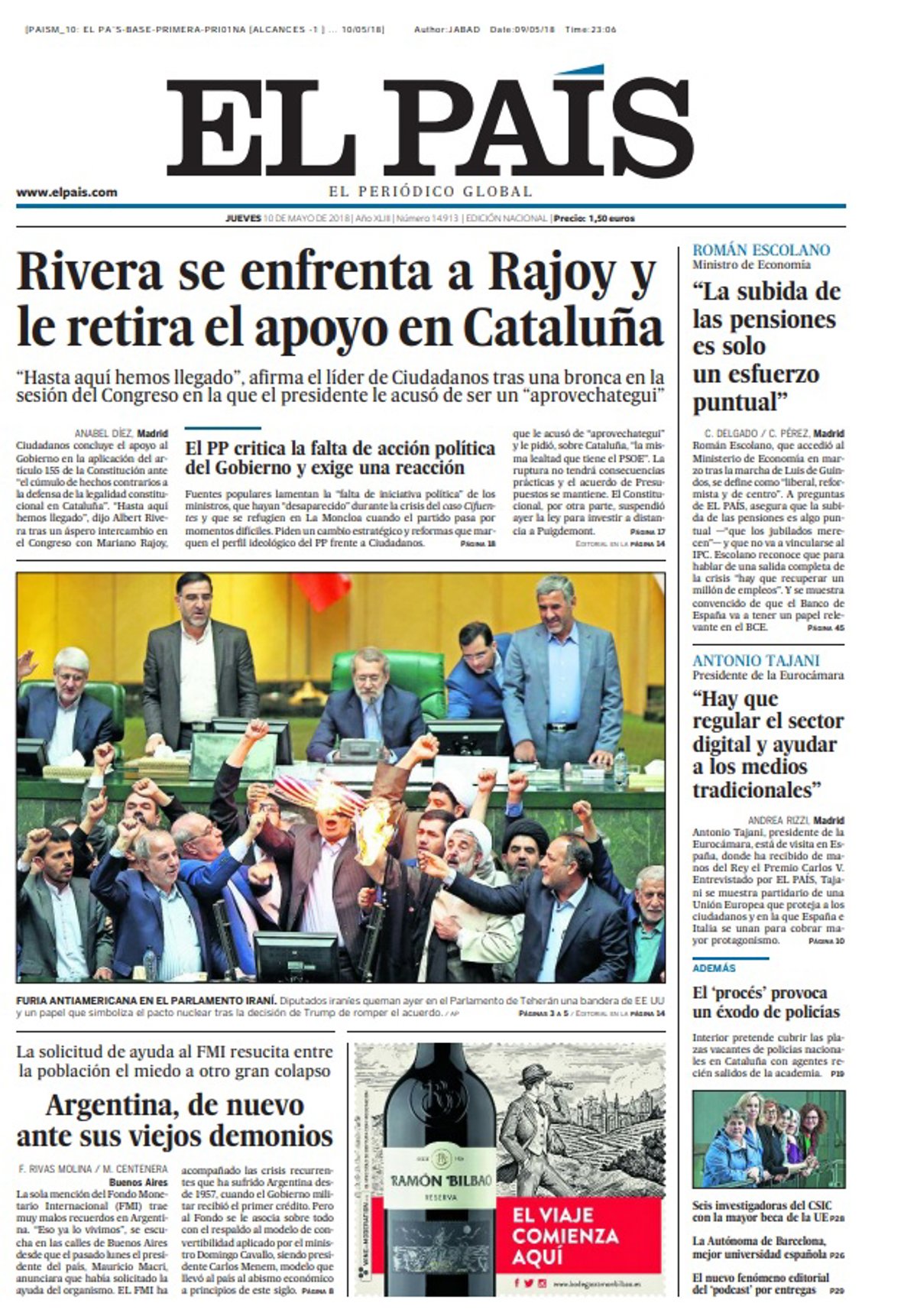 EL PAÍS: "Rivera se enfrenta a Rajoy y le retira el apoyo en Cataluña"; "'La subida de las pensiones es solo un esfuerzo puntual'"; "Argentina, de nuevo ante sus viejos demonios"; "'Hay que regular el sector digital y ayudar a los medios tradicionales'".