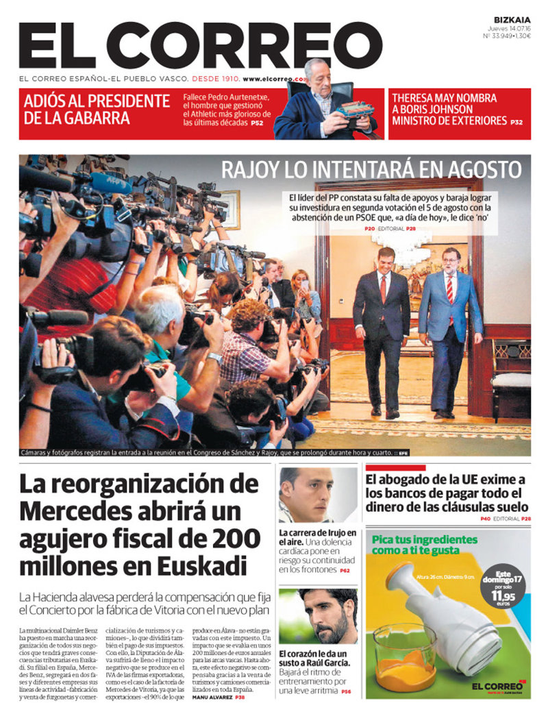 EL CORREO: "La reorganización de Mercedes abrirá un agujero fiscal de 200 millones en Euskadi"; "El abogado de la UE exime a los bancos de pagar todo el dinero de las cláusulas suelo"; "Rajoy lo intentará en agosto"; "Theresa May nombra a Boris Johnson ministro de Exteriores".