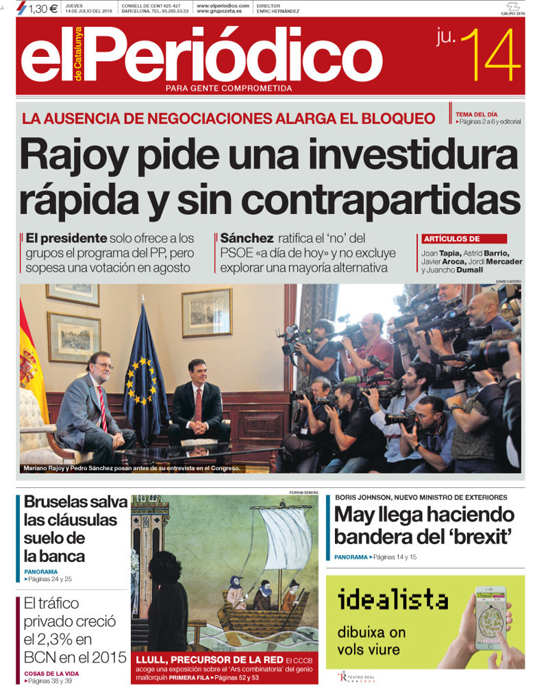EL PERIÓDICO: "Rajoy pide una investidura rápida y sin contrapartidas"; "Bruselas salva las cláusulas suelo de la banca"; "May llega haciendo bandera del 'brexit"; "El tráfico privado creció el 2,3% en BCN en el 2015".