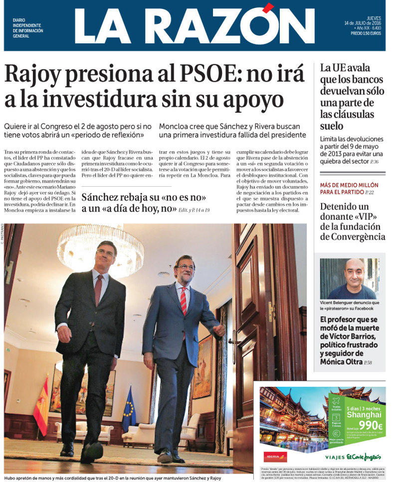 LA RAZÓN: "Rajoy presiona al PSOE: no irá a la investidura sin su apoyo"; "Sánchez rebaja su "no es no" a un "a día de hoy, no"; "La UE avala que los bancos devuelvan sólo una parte de las cláusulas suelo"; "Detenido un donante "VIP" de la fundación de Convergència".