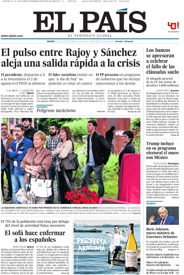 EL PAÍS: "El pulso entre Rajoy y Sánchez aleja una salida rápida a la crisis"; "Los bancos se apresuran a celebrar el fallo de las cláusulas suelo"; "Trump incluye en su programa electoral el muro con México"; "La izquierda abertzale se suma por primera vez al homenaje a Miguel Ángel Blanco".