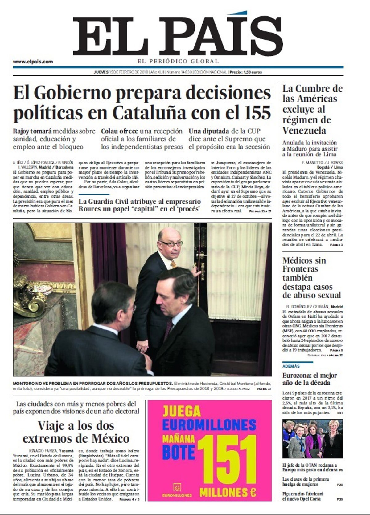 EL PAÍS: "El Gobierno prepara decisiones políticas en Cataluña con el 155. La Guardia Civil atribuye al empresario Roures un papel "capital" en el 'procés'"; "Montoro no ve problema en prorrogar dos años los Presupuestos"; "Viaje a los dos extremos de México. Las ciudades con más y menos pobres del país exponen dos visiones de un año electoral"; "La Cumbre de las Américas excluye la régimen de Venezuela"; "Médicos sin Fronteras también destapa casos de abuso sexual".
