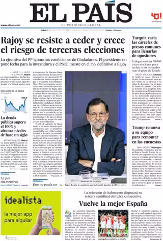 EL PAÍS: "Rajoy se resiste a ceder y crece el riesgo de terceras elecciones"; "Turquía vacía las cárceles de presos comunes para llenarlas de opositores"; "Trump renueva a su equipo para remontar en las encuestas"; "La deuda pública supera el 100% y alcanza niveles de hace un siglo".