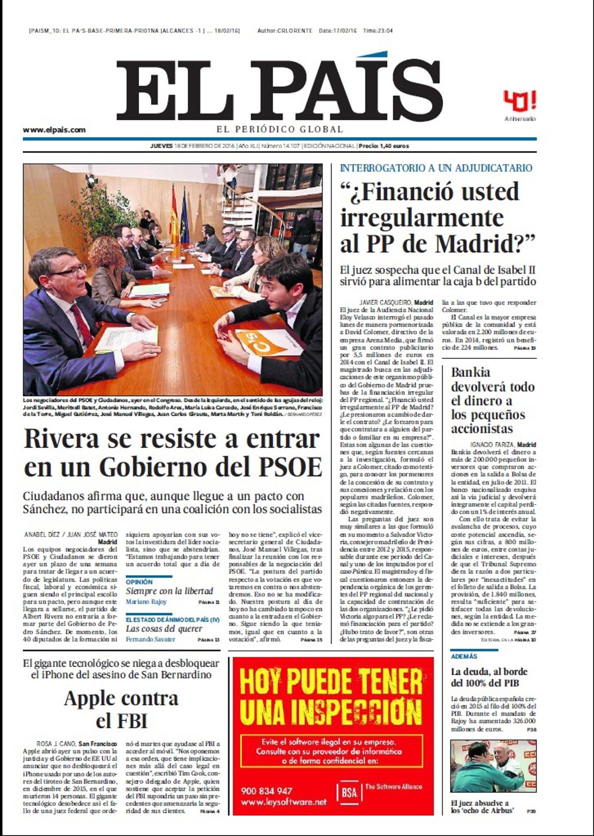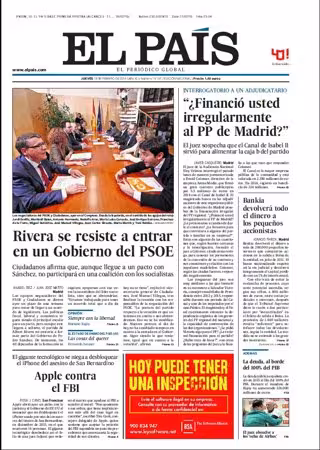 EL PAÍS: "Rivera se resiste a entrar en un Gobierno del PSOE"; "Interrogatorio a un adjudicatario. "¿Financió usted irregularmente al PP de Madrid?". El juez sospecha que el Canal de Isabel II sirvió para alimentar la caja b del partido"; "Apple contra el FBI. El gigante tecnológico se niega a desbloquear el iPhone del asesino de San Bernardino"; "Bankia devolverá todo el dinero a los pequeños accionistas".