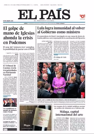 EL PAÍS: "El golpe de mano de Iglesias ahonda la crisis en Podemos. El cese del 'número tres' complica la posibilidad de pactar con el PSOE"; "Lula logra inmunidad al volver al Gobierno como ministro"; "El Tribunal de Cuentas revela irregularidades en Patrimonio Nacional"; Los republicanos se quedan sin opciones contra Trump".