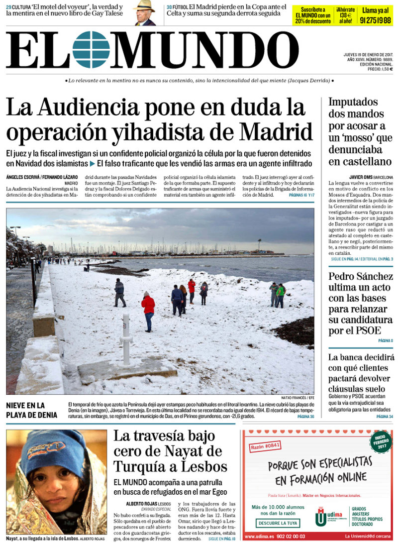 EL MUNDO: "La Audiencia pone en duda la operación yihadista de Madrid"; "Imputados dos mandos por acosar a un 'mosso' que denunciaba en castellano"; "Pedro Sánchez ultima un acto con las bases para lanzar su candidatura por el PSOE"; "La travesía bajo cero de Nayat de Turquía a Lesbos".