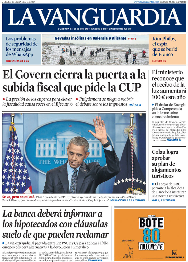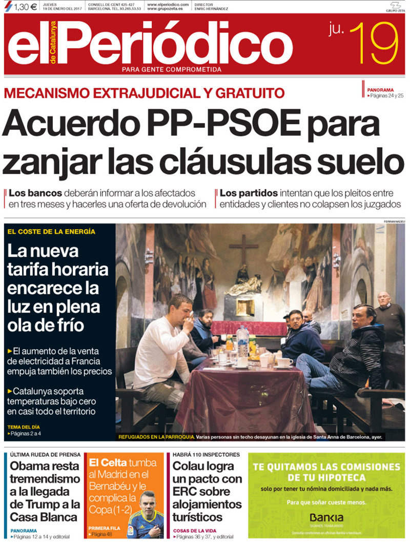 EL PERIÓDICO: "Acuerdo PP-PSOE para zanjar las cláusulas suelo"; "La nueva tarifa horaria encarece la luz en plena ola de frío"; "Obama resta tremendismo a la llegada de Trump a la Casa Blanca"; "Colau logra un pacto con ERC sobre alojamientos turísticos".