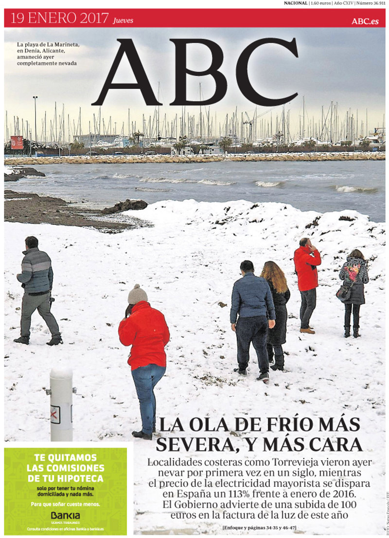 ABC: "La ola de frío más severa, y más cara. Localidades costeras como Torrevieja vieron ayer nevar por primera vez en un siglo, mientras el precio de la electricidad mayorista se dispara en España un 113% frente a enero de 2016. El Gobierno advierte de una subida de 100 euros en la euros en la factura de la luz de este año".