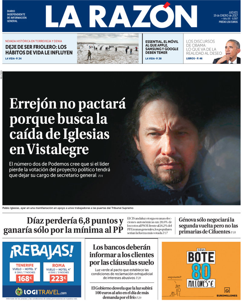 LA RAZÓN: "Errejón no pactará porque busca la caída de Iglesias en Vistalegre"; "Díaz perdería 6,8 puntos y ganaría sólo por la mínima al PP"; "Génova sólo negociará la segunda vuelta pero no las primarias de Cifuentes"; "Los bancos deberán informar a los clientes por las cláusulas suelo".