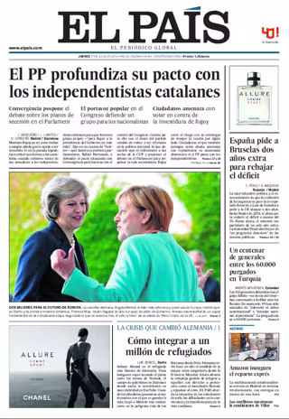 EL PAÍS: "El PP profundiza su pacto con los independentistas catalanes"; "Dos mujeres para el futuro de Europa. La canciller alemana, Angela Merkel, la líder más veterana y poderosa de Europa, recibió ayer en Berlín a la primera ministra británica, Theresa May"; "Como integran a un millón de refugiados"; "España pide a Bruselas dos años extra para rebajar el déficit"; "Un centenar de generales entre los 60.000 purgados en Turquía".