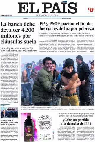 EL PAÍS: "La banca debe devolver 4.200 millones por cláusulas suelo"; "PP y PSOE pactan el fin de los cortes de luz por pobreza"; "El sospechoso del ataque de Berlín tenía orden de expulsión"; "Tragedia en un mercado pirotécnico de México".