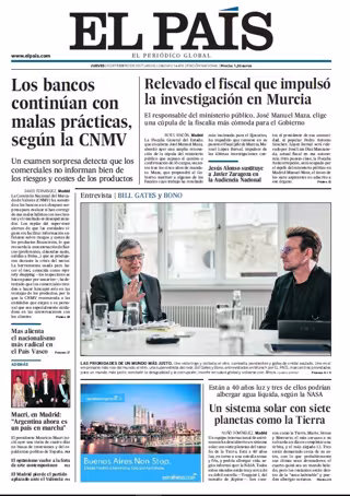 EL PAÍS: "Los bancos continúan con malas prácticas, según la CNMV"; "Relevado el fiscal que impulsó la investigación en Murcia. Jesús Alonso sustituye a Javier Zaragoza en la Audiencia Nacional"; "Entrevista a Bill Gates y Bono. Las prioridades de un mundo más justo"; "Un sistema solar con siete planetas como la Tierra"; "Mas alienta el nacionalismo
