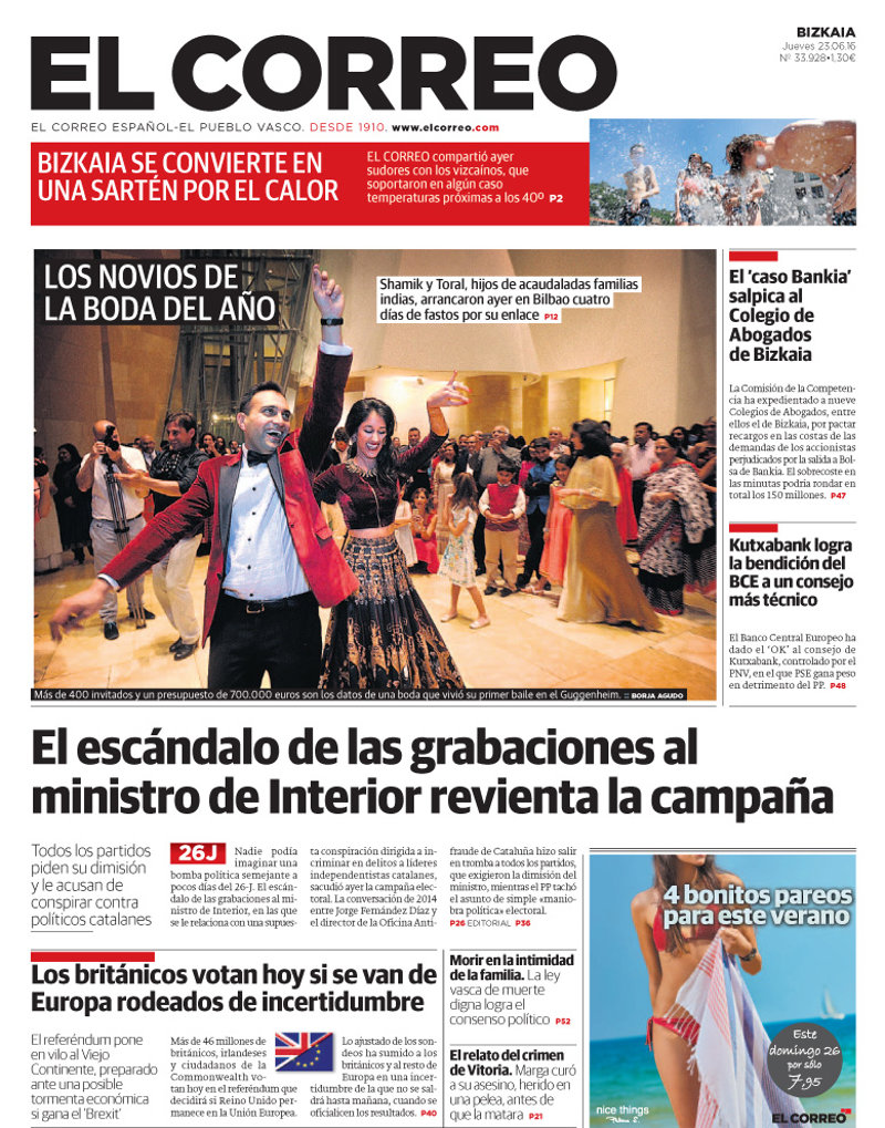 EL CORREO: "El escándalo de las grabaciones al ministro de Interior revienta la campaña"; "Los británicos votan hoy si se van de Europa rodeados de incertidumbre"; "El 'caso Bankia' salpica al Colegio de Abogados de Bizkaia"; "Kutxabank logra la bendición del BCE a un consejo más técnico".