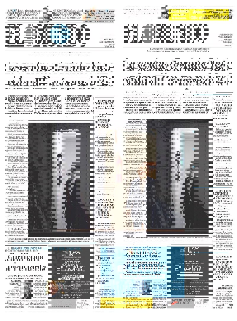 EL MUNDO: "Las escuchas a Fernández Díaz le estallan al PP en vísperas del 26-J"; "Churchill votaría por la permanencia". Su nieto se posiciona en contra del Brexit"; "Pedro Sánchez: "No va a haber 'sorpasso' ni en escaños ni en votos"; "Acuerdo entre el Gobierno y las FARC: "Hoy será el último día de la guerra".