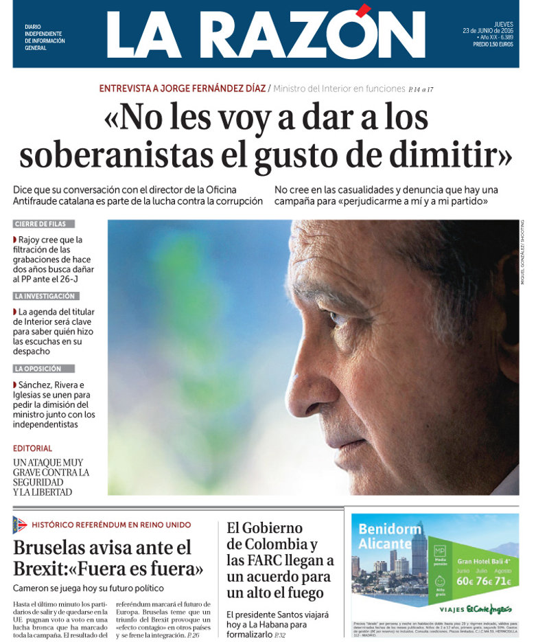 LA RAZÓN: "Jorge Fernández Díaz: "No les voy a dar a los soberanistas el gusto de dimitir"; "Bruselas avisa ante el Brexit: "Fuera es fuera"; "El Gobierno de Colombia y las FARC llegan a un acuerdo para un alto el fuego".